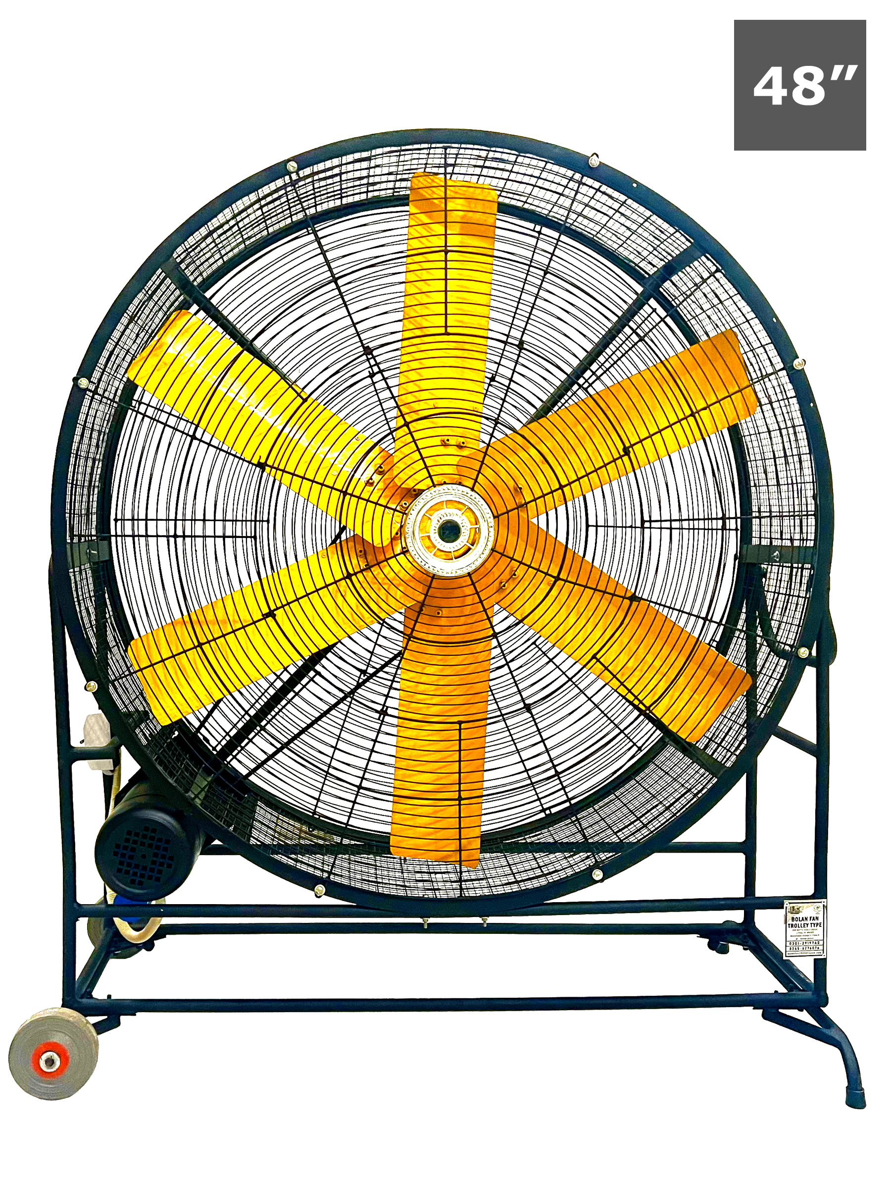WITH 950 , SINGLE/3- PHASE MOTOR, COPPER WINDED MOTOR, BELT DRIVE, 425 RPM, 24,000 CFM, G.I. SHEET BLADES, TROLLEY TYPE